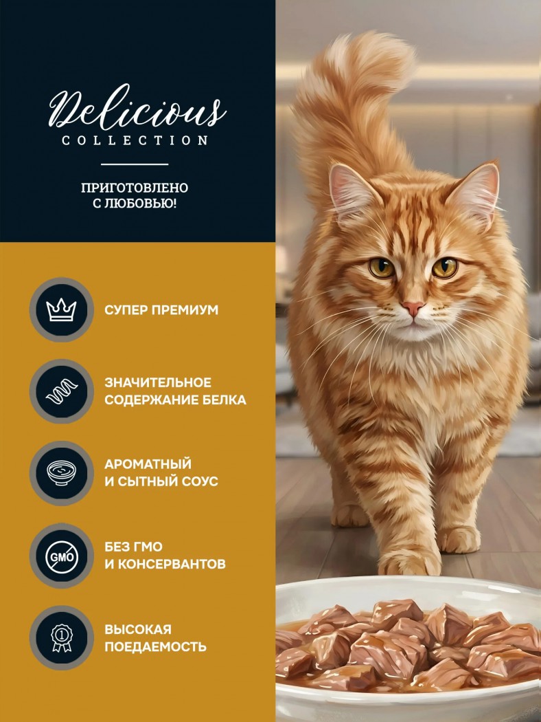 Основа рациона: в основе корма — нежное филе цыплёнка и тунец в аппетитном соусе, качественные источники белка и питательных веществ.