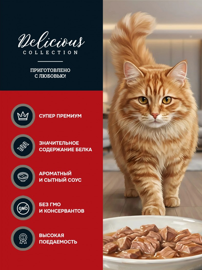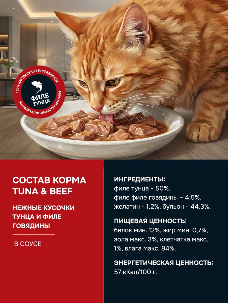 Основа рациона: в основе корма — нежный тунец и сочное филе говядины в аппетитном соусе, качественные источники белка и питательных веществ.